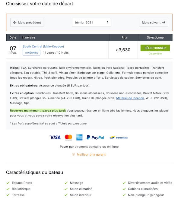 - Les liens pour vérifier les disponibilités et réserver directement sur liveaboard.com